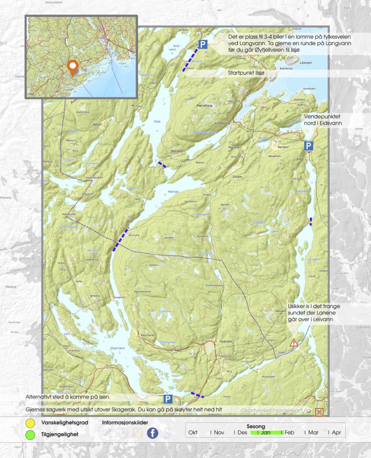 Parkering ved Ilsjø. Ta gjerne en runde der før du går Øyfjellveien ned til nordspissen av Ilsjø. Runden ender opp i Eidsvann. Det er et par hundre meter fra nordenden til Barlandskilen (saltvann). Der er det også mulig å parkere noen få biler dersom det er snøfritt.