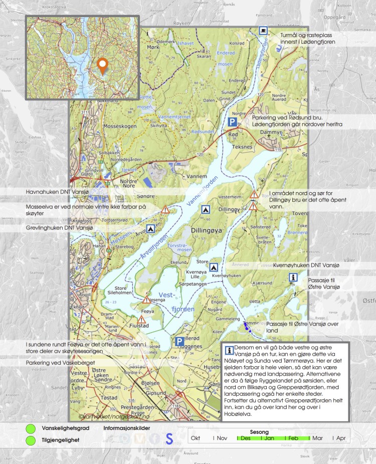 Senere i sesongen, når isen legger seg på større områder, frister en tur på Vanem-fjorden, og rundt Dillingøya. På denne turen vil en normalt måtte benytte landpassering nord eller sør for Feøya, og forbi Dillingøy bru. Det mangler ikke på plasser for bål og rast, gjerne sør eller vestvendte. Prøv gjerne Grevlinghuken på Årevoldtangen, Havnahuken på Dillingøy og Kvernøyhuken på Store Kvernøy.
