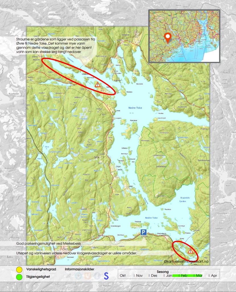 Nedre Toke er et av de store vannene i Kragerøvassdraget der de større områdene legger seg først på de litt utpå nyåret. Det er lett å parkere med bil i sørenden, og sikkert flere andre steder, og egner seg for en heldagstur på isen. Med sine mange fjorder og øyer, er det en sann perle å skøyte.