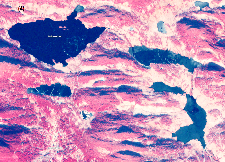 Bildet med mye rødt viser vannene nord for Sjusjøen med noe eldre is på de mindre vannene med en mer grålig overflate. I nord ser man reinsvannet som hadde helt nylagt stålis på store deler. Uten satellittene hadde vi ikke havnet her. Det siste bildet viser islegging ved Malmøya og noe som ikke var farbar is. Det er ikke alltid forholdene er slik man håper bare utifra satellittbilder.