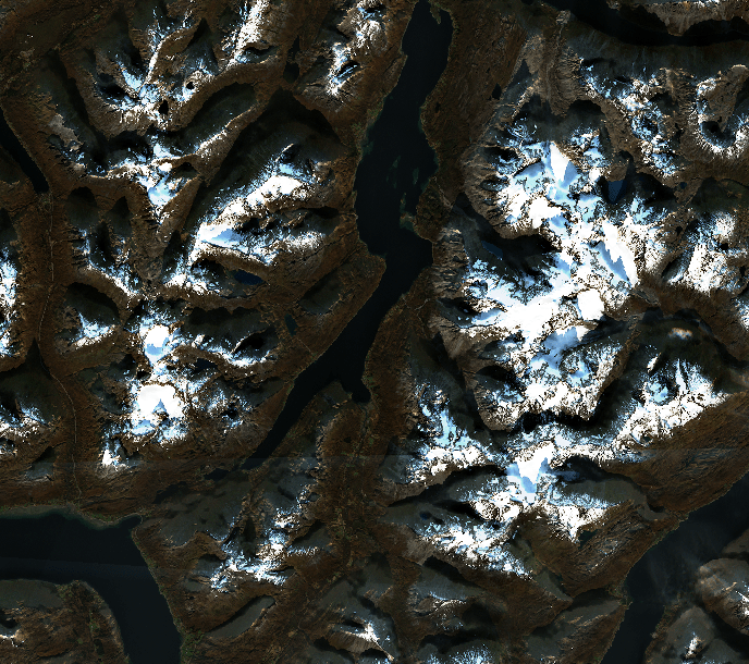 Når en har valgt bilder kan de vises med ulike kominasjoner av bånd. Det kan være Tru color eller False color som vist i eksemplene under. False color gir god kontrast mellom bakke og is/snø og brukes ofte.