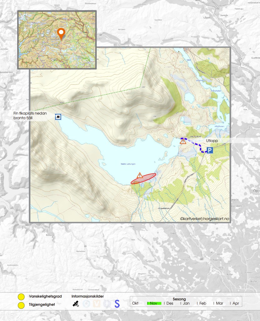Delvis omgiven av branta fjäll, och med utsikt uppemot Besseggen, är denna lilla sjö en pärla att fånga tidigt på säsongen.