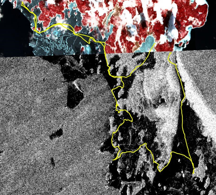 I tillegg til optiske bilder fra Sentinel-2 brukes også Synthetic Aperture Radar (SAR) bilder fra Sentinel-1 når vi speider etter is fra rommet. I bildet over er øverste del fra optisk (falske farger), mens nederste gråtonebilde er hentet fra et SAR-bilde fra den dagen vi gikk turen. GPS-spor kan legges over på samme måter som for optiske Sentinel-2 bilder. En grundigere omtale av SAR og erfaringer med bruk for planlegging av skøyteturer vil bli gitt i del 3 av Isspeiding fra rommet (kommer senere).