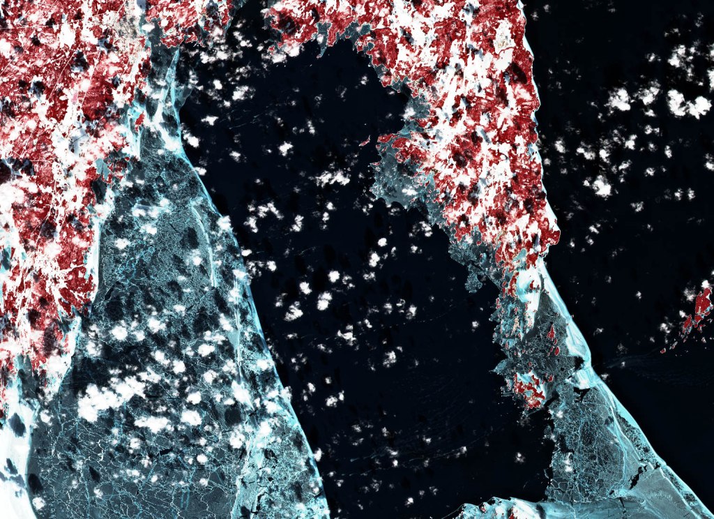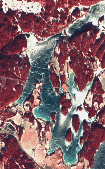 Sentinel-2 satellittbilder har nærmest haglet i ulike fora for turskøyting om dagen. Bildet under viser Vestvannet fra den 14. februar 2021, midt i en lang kuldeperiode med utallige rapporter fra området. Grunnen til ofte brukt filter hvor terreng tegnes i rødt er at dette gir god kontrast til is og vann i området.