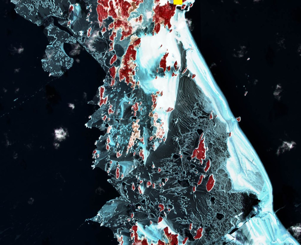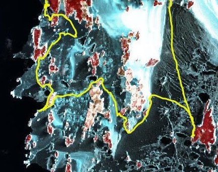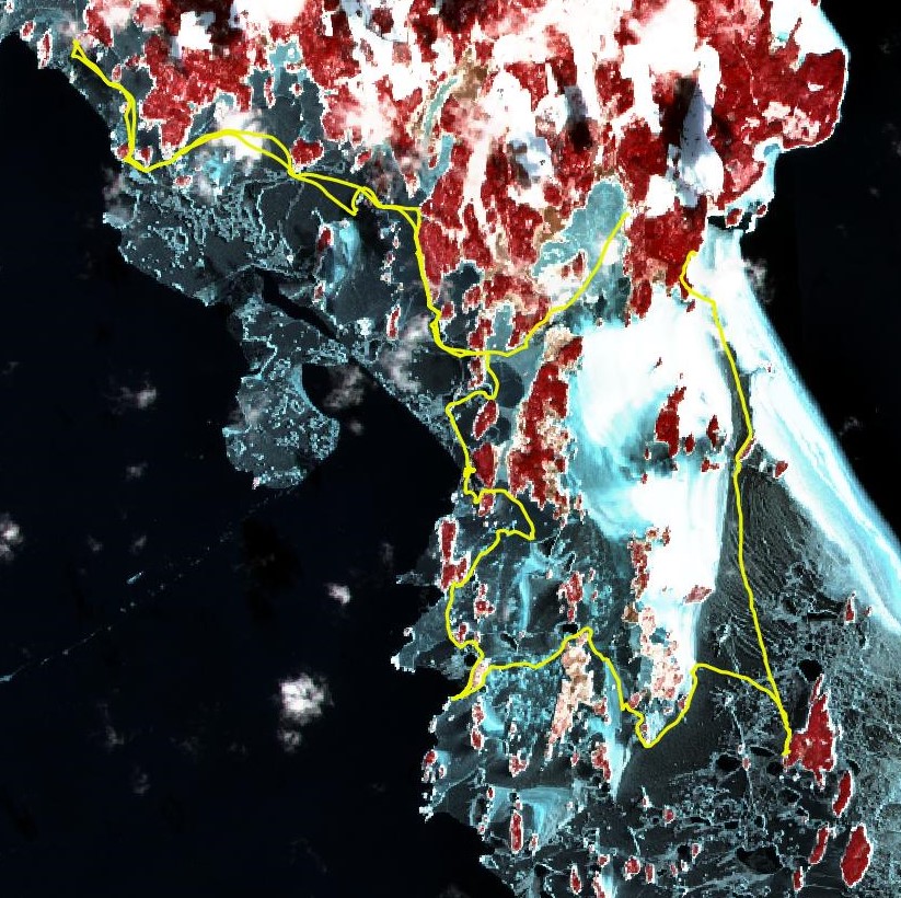 Startpunkt var ved parkering i nord vist med gul firkant. Planen var å komme ned til stripe med mørkere is rett i syd og utforske videre sydover. De hvite nære områdene i nord viste seg å være vrakisområder som delvis beveget seg mye pga kraftig sjø inn fra øst og vi måtte gå et godt stykke i terrenget for å komme oss ut på den gamle vrakisen (tallerkenis) i smulere farvann. Jo lenger vekk og sydover vi kom jo større og større glatte partier av stålis fant vi. Dette forandret seg når vi nærmet oss øygruppen i syd og litt øst hvor åpne områder og svakere is møtte oss. Noen mørkere områder er observerbare men det er vanskelig å manøvrere seg godt mellom ulike iskvaliteter med en utskrift av bildet i A3 med seg på isen. Hvor på bildet er vi egentlig nå?