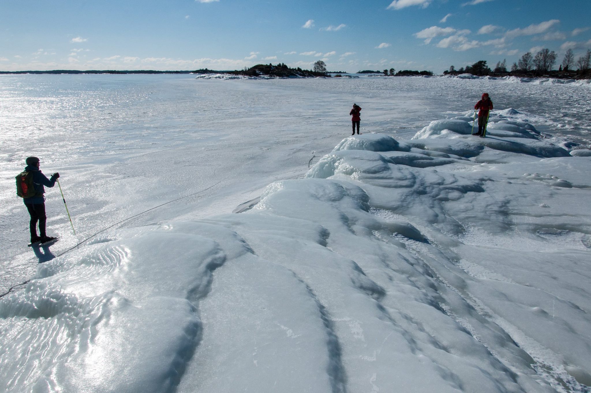 I det store oversiktsbildet under kan en se konturene av is med ulik farging ut fra neset til høyre i bildet samt et enormt isdekket område til venstre over det havområdet som heter Dalbosjöen. Grovplanen var å prøve å ta seg ut i skjærgården til høyre i retning Lurö på dag 1 og så skøyte i de vestlige isene på dag 2.