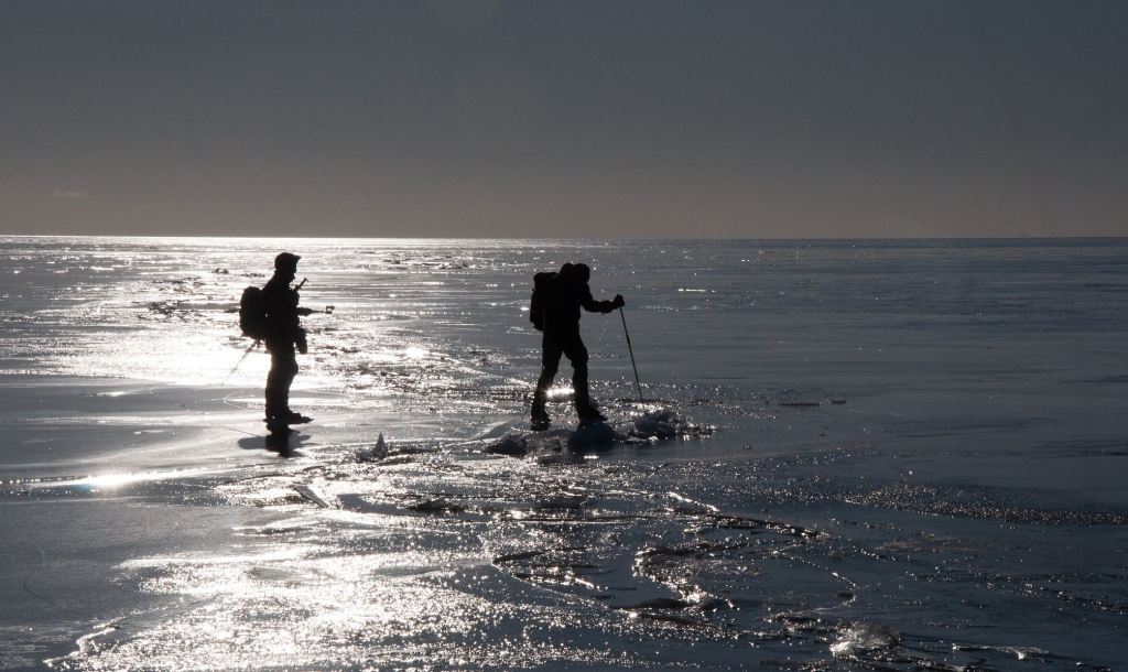 Bildet viser tydelig sprekker/råker hvor nedsmeltet snø eller vann som har trukket opp har dannet hvite isstriper i overgangene. Områder med hvitere og mørkere is kan observeres. I en slik periode med mange turer er sporene og beskrivelsene også tallrike og bildene blir kun tilleggsinformasjon som kan brukes i planleggingen av tur.