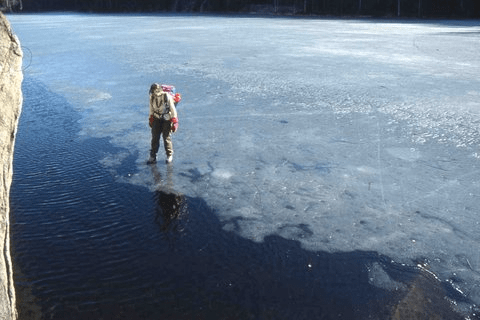 Isen hadde allerede gått på Nøklevann, da jeg sykla forbi fra Ulsrud, men på lille Hauktjern var det tykk is over det meste av vannet. Jeg var på jakt etter et vann hvor vi kunne gjøre en plumpeøvelse på våris. Dumt nok var jeg alene, og det var for sent på formiddagen. Jeg starta i sørenden på fast hard knudrete is hvor staven knapt satte merke, og holdt meg langs land, men vel halvveis sa det bare svusj, og der lå jeg. Det var ikke noe sol på isen, men det hadde vært sol der ei lita stund tidligere. Tjernet ligger nede i terrenget og er skjerma for sol mye av dagen, men akkurat her hadde sola smuldra opp isen, og når det første hadde gått hull, fortsatte oppløsningen også der den først hadde vært solid, omtrent som å ta bort strikken rundt pinner som holdes sammen. Staven jeg la på isen for å løfte meg opp, forsvant bare ned i. Jeg måtte bryte tykk is inn mot land, og kave vekk isklumper. Etter ei stund ble jeg sliten, men to unge damer som var ute på joggetur, så meg fra andre siden av vannet, og ropte over. Jeg sa det gikk greit, men begynte å bli sliten. De hadde ringt luftambulansen med en gang de så meg, og da jeg fikk høre det, la jeg meg bare til i råka, helt stille, for å spare varme og krefter, og vente på helikopteret. Det var et riktig valg. Jeg hadde fremdeles 10 – 15 meter til land.