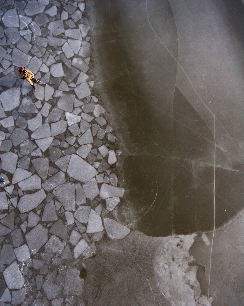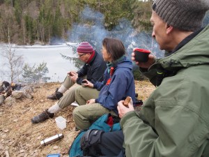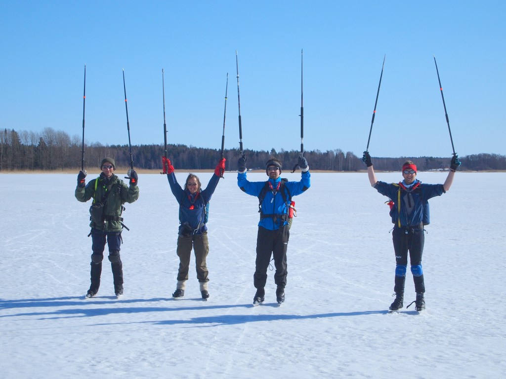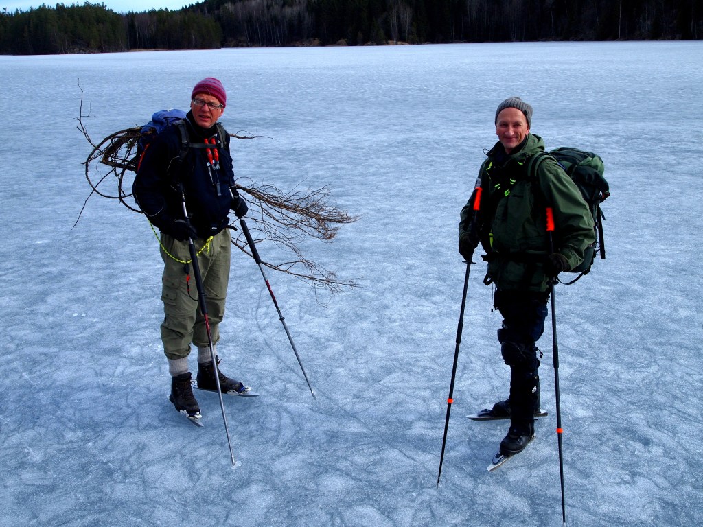 Vi hadde flere interessante vårisopplevelser i 2008. To måneder tidligere enn Hauktjern, allerede 17 februar, var Oddvin, jeg og en til på Gjersjøen, med plussgrader og ny stålis, som jeg hadde målt til 5 cm dagen før, men da var det minusgrader. Etter litt avansert fotografering fra en drage, dette var før dronene, og Oddvin er en pioner på fantasifull fotografering fra oven, dro vi sørover rundt Kjerringnebba til den lille holmen Geitungen, hvor vi vurderer å gå i land for å ta nista i sola, men så opplever vi noe skummelt. Staven går rett gjennom isen når jeg skyver fra. Vi var glade vi ikke hadde tatt lunchen på holmen i sola.