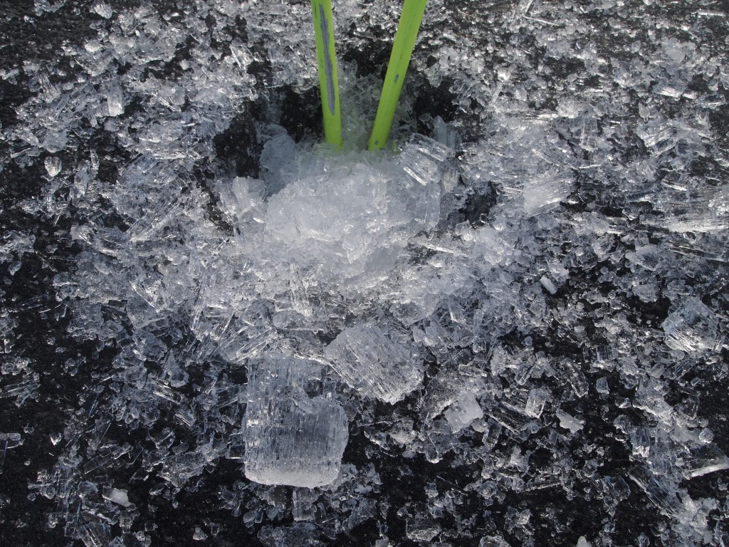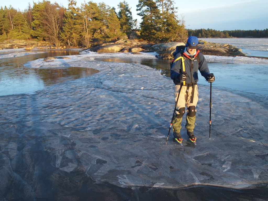 To dager etter sjekket vi isen på ny. Det var viktig å komme seg raskt ut på igjen for å unngå at opplevelsen skulle sette seg i kroppen. Vi starta noen timer tidligere, og da var det hard bærekraftig is over det hele. Det var umulig å få isen til å briste, selv der den var omgitt av åpent vann. (bilde)