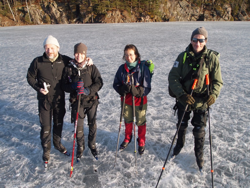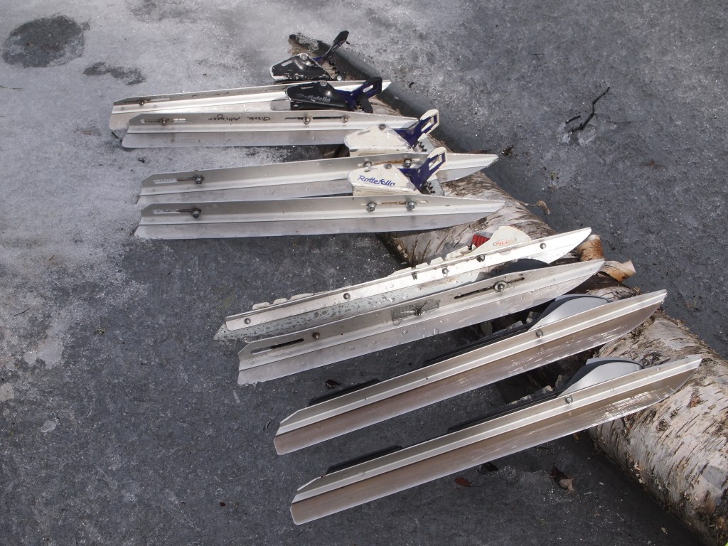 Noen år senere, våren 2013, var det en spesielt bra og lang vårsesong. 23 og 27 mars skøyta vi hele Mosseleva ut under E6 og ned til Krappfoss, og 20 – 28 april hadde vi mange turer på Nøklevann og Elvåga. Sesongen ble avslutta på Nøklevann 1 mai, på hard fast litt bulkete is, helt i sør, i skyggen langs land fra Rustadsaga og østover mot Kattisa. Teoretisk kan vi altså ha 1 – 2 måneder igjen, men nå avhenger det meste av været, om det blir varmegrader, og sol, eller kulde og sol, eller kulde og overskya. Selv med plussgrader kan det være skøyteføre dersom det har vært klarvær på natta. Hovedregelen for denne tida vi nå går inn i, er at man må ut tidlig på morran hvis det er sol, og avslutte før overflata blir for myk, eller hele strukturen kollapser. Det er viktig å ta prøver av isen og sjekke at den har god nok struktur til å bære selv om overflata svikter. Allerede nå 1 mars, ser vi tydelige tegn på strukturendringer i isen, både på overflata og nede i. Med stavene hogger vi løs klumper som likner krystall. Etter som dagene går og isen smulder videre, vil overflata få mer og mer karakter av små klumper og «sukker». Slår man løs større biter, og slipper ned eller bare setter ned, vil de falle fra hverandre. På våris er det mye viktigere enn noen gang, å aldri gå alene, og å ha med seg sikkerhetsutstyr, særlig sekk å flyte på, og kasteline. Det er som jeg erfarte, umulig å ta seg opp på godt utvikla våris ved egen hjelp.