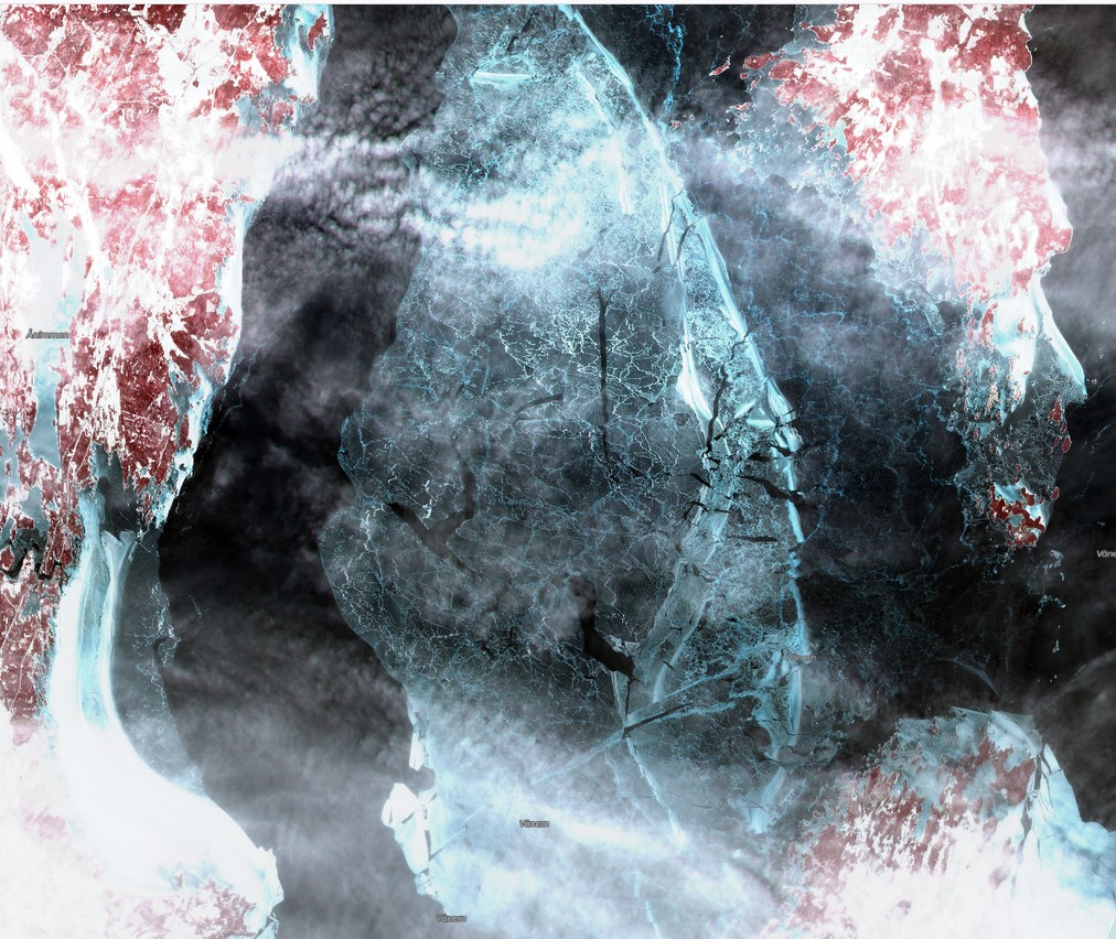 Ikke bare var det noen lokale forflytninger som var på gang. Da kunne vi trolig bare fulgt sprekken til enden og gått rundt. Denne dagen hadde store deler av Dalbosjöen kommet i drift. Et sammenhengende isområde trolig med interne større flak på ca 550 km2 hadde kommet i drift fra vest mot øst.