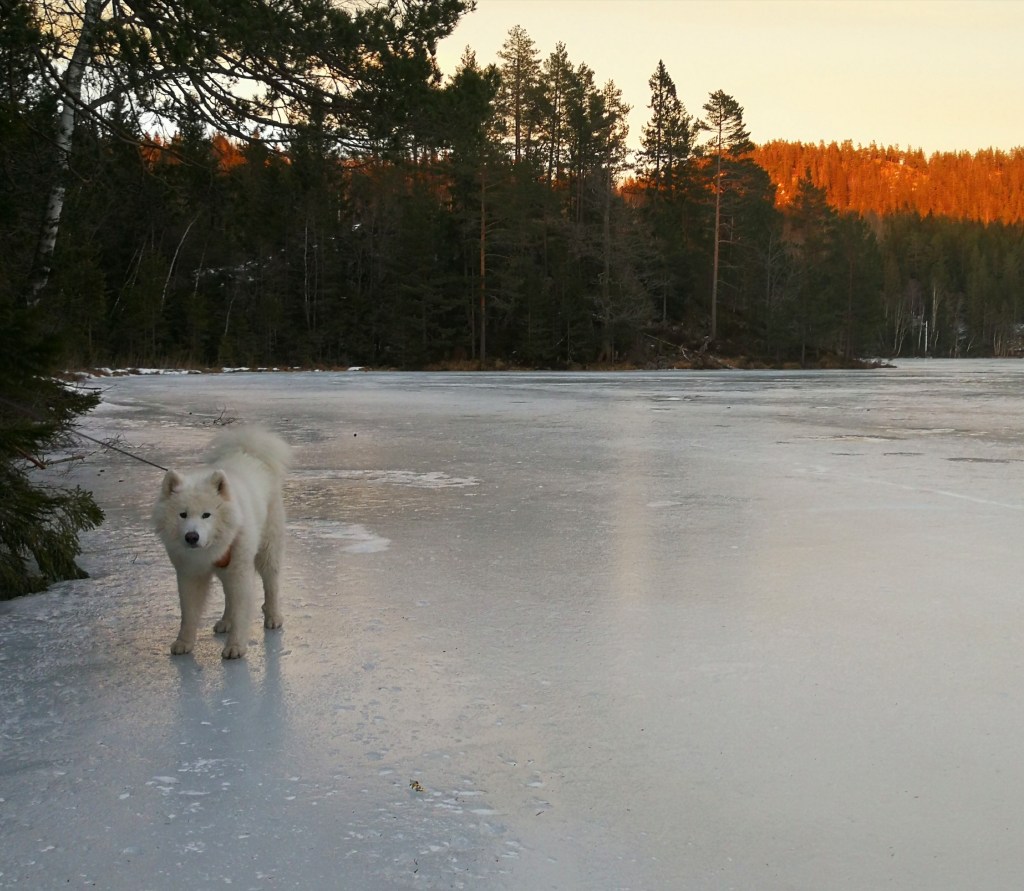 Etter en snau times kaving som endte i ei blaut myr, kom vi oss omsider utpå Tonevann under en rosarødsprengt kveldshimmel og med Tonekollen opplyst av gyllen kveldssol. En Narnia-krysning mellom ulv og isbjørn dukket opp på isen, og da innså jeg at det virkelig var på tide å komme seg i badekaret.