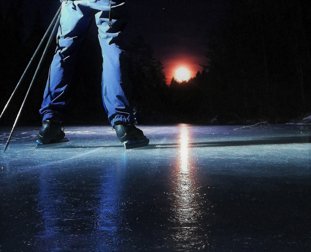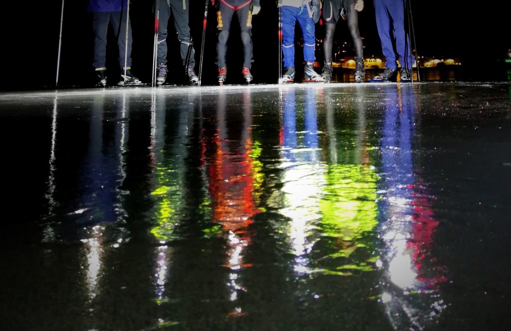 Vi andre fortsatte ned Langen, over til Høljer’n som er en lumsk men vakker, bortgjemt og ofte glemt perle. Videre gikk ferden over Våg, hvor bebyggelsen i Våglia speilet seg i isen, før vi fortsatte ned til Mjær. Når ingen ser meg, må jeg alltid teste langsklia på skolen i vannkanten der, og denne natta ble ikke noe unntak. Vi var på tur og hadde ikke noe vi skulle rekke. Og jeg elsker lange sklier. På Mjær var det plutselig åpent vann både til høyre og venstre for skøytene, og jeg forbannet meg over at jeg heller ikke denne vinteren rakk å skaffe meg skikkelig hodelykt. Langrennstavene var heller ikke veldig egnet for å teste isen, så jeg fikk låne skikkelig isstav for å ta oss trygt over det mest utsatte partiet. Gjengen fulgte etter som en lysende orm som snodde seg mellom de åpne partiene, mens lyktene gav gjenskinn i vannet og isen. Vi var skikkelig i gang. Det er dette som er turskøyting.
