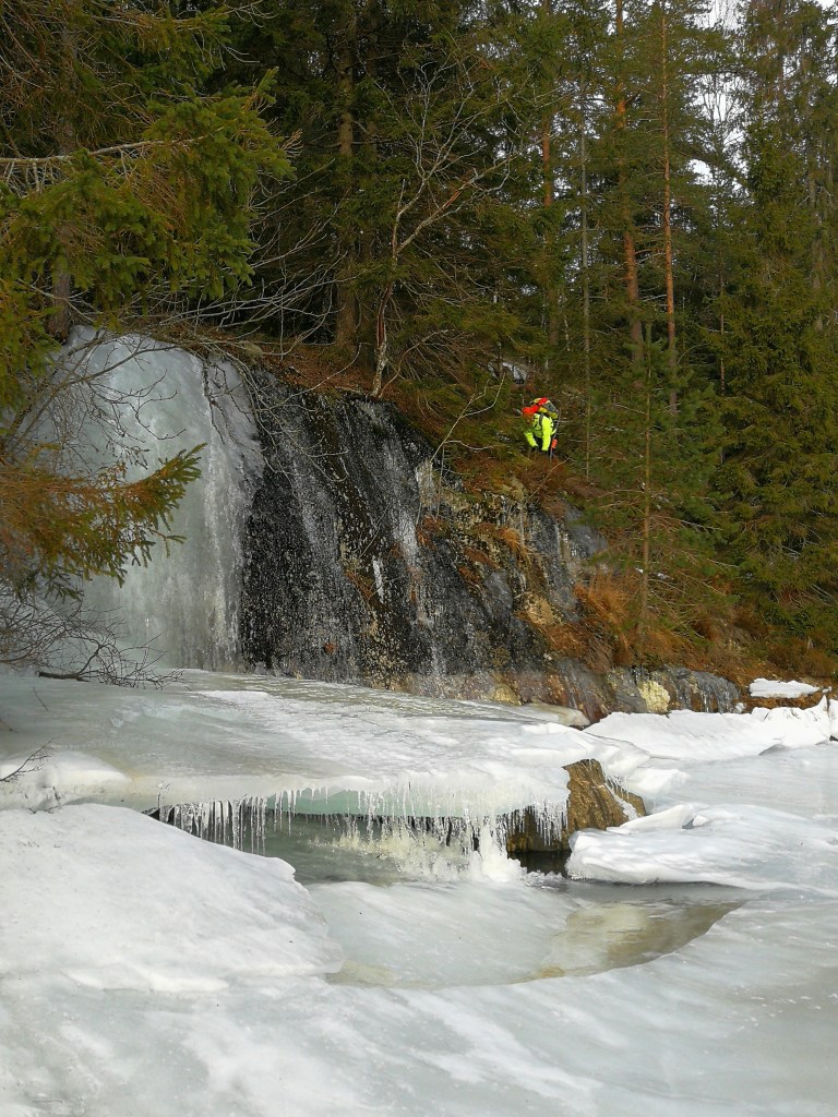 En råk på ca én mannslengde derimot, er akkurat passe stor til at man med litt fart både lander hardt i kanten på den andre siden, og samtidig får seg et bad. Legg til at råken kommer så overraskende at hodet er det som tar iskanten først, så har du ulykken som inntraff 8 sekunder inn i denne turen. Jo Inge og vi andre er nøye med å bruke hjelm – når vi sykler, så hjelmen til Jo Inge fikk heldigvis ikke en eneste skramme der den lå i bilen. Han dro fram tørt skift og lappesaker, men jeg protesterte og sa at dette var syjobb for fagfolk, så han ble noe motvillig fraktet til Ski sykehus.