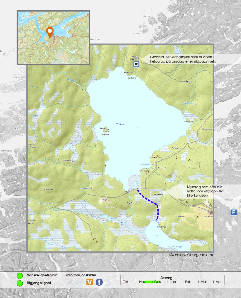 På grunn av størrelsen kan det ofte vere varierande isforhold på Skjellbreia. Opp bakken på nordsida av vatnet ligg Grønnlia, ei serveringshytte som er åpen i helga, og onsdag ettermiddag/kveld. Turen frå Granåsen og opp til Grønnlia kan vere ein fin søndagstur på hausten før snøen har inntatt Bymarka. Sjå forøvrig beskrivelsen av Lille-Leirsjøen og Leirsjøen.