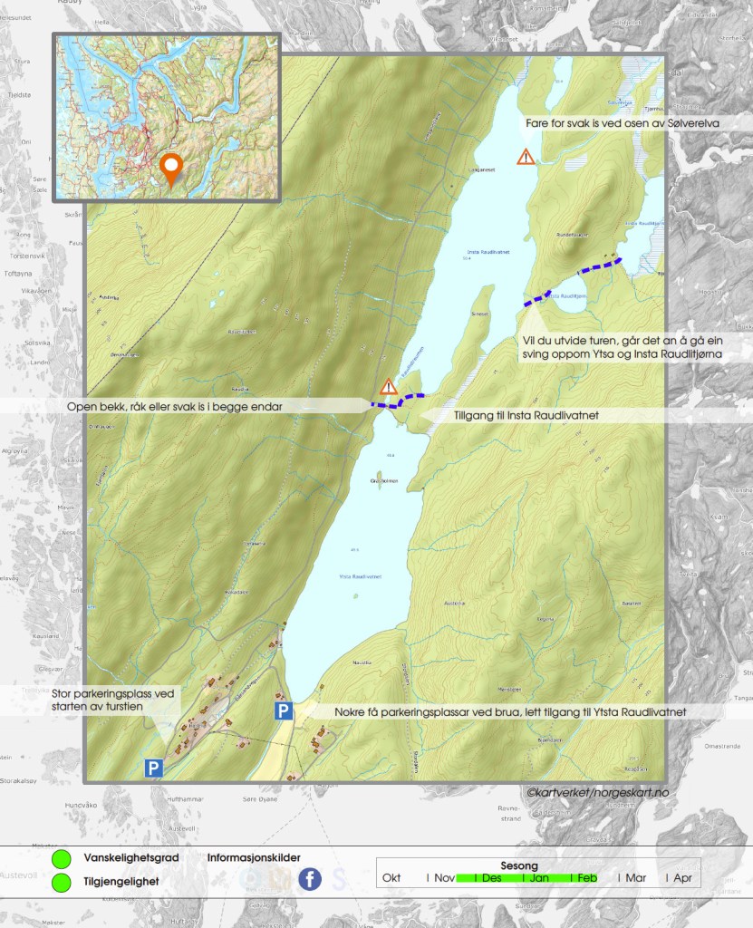 Ta av Gåssandvegen frå fotballbanen på Søfteland, til ein stor parkeringsplass ved Hatlelia, 500m før Ysta Raudlivatnet. Skal du til Insta Raudlivatnet når det ikkje er is på Ytsta, så følger du skogsvegen frå Hatlelia, på vestsida av vatnet. Det er også plass til nokre bilar ved osen, rett før brua.