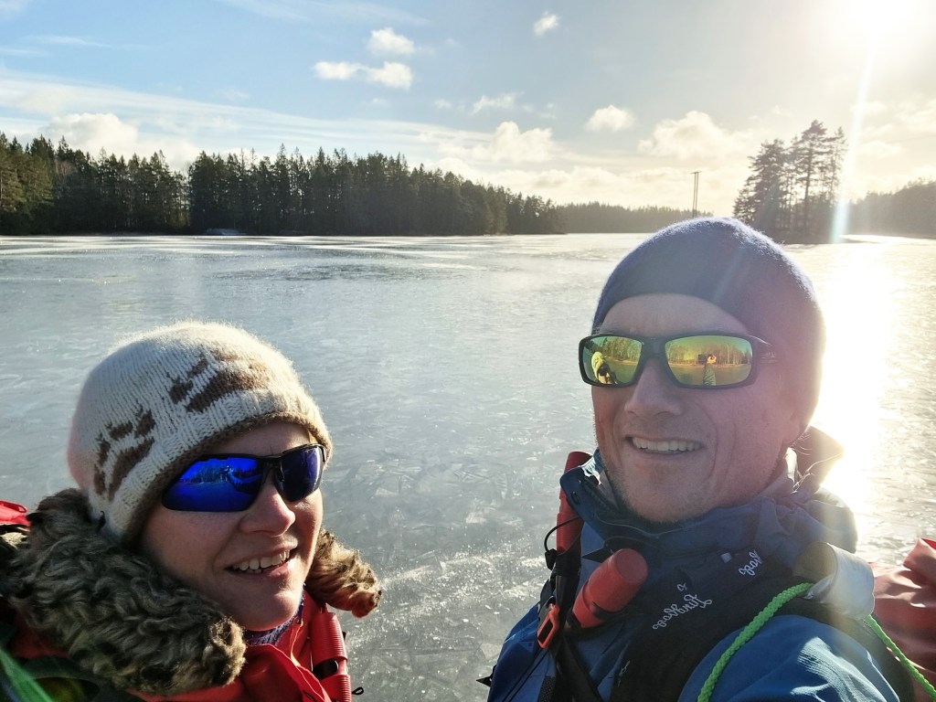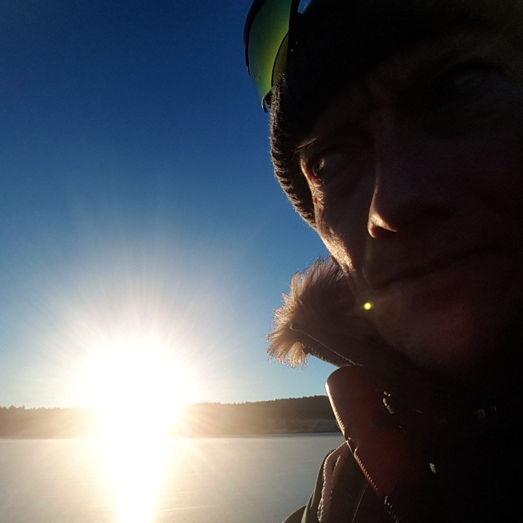 Vi parkerer bilen ved noe vi tror er en forlatt butikk, ved Kornsjø stasjon, og går ned mot vannet. Isen ser slett ut, men i motlyset er umulig å vurdere den, så jeg tør ikke å kjenne på følelsene før jeg har gått en liten runde og kjent at det ikke er noen som helst tegn til problematisk overis. Det er helt fantastisk! Glassklar svart stålis, mer enn tykk nok, og med en lydløs og helt blank overflate.