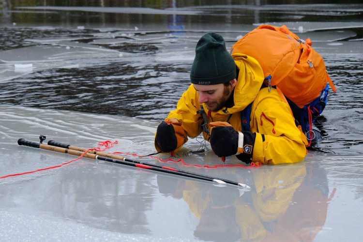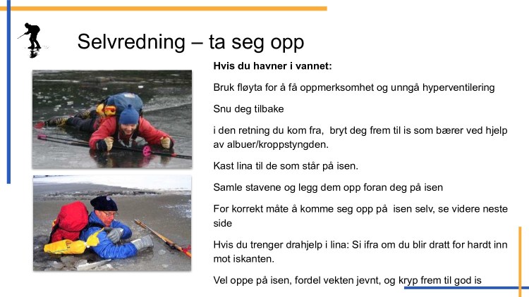 Øvelser kan ses på Facebook : …. Vi anbefaler at man kaster lina til de andre så tidlig som mulig. Det kan være greit å ha gjort hvis senere blir sliten og ikke lenger i stand til å kaste den. Da får kan man drahjelp hvis det trengs. De som står på isen er mobile og kan lett fange opp din line, mens det kan være vanskelig for dem å treffe deg med sin line.