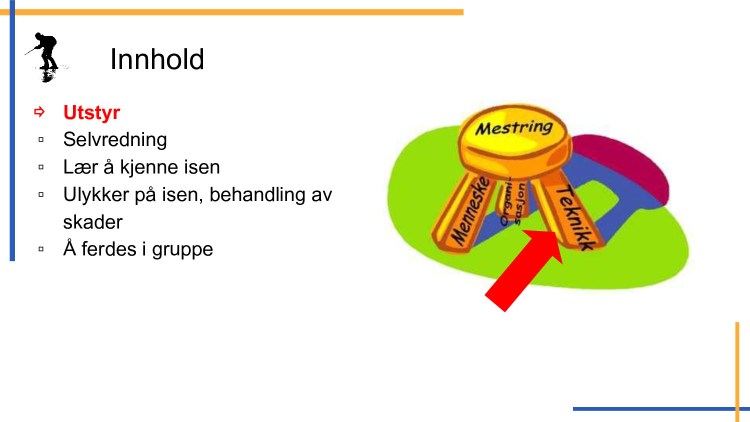 Vi begynner med utstyret. Det er viktig at hver enkelt turskøyter vurderer eget utstyr, setter seg inn i hvordan det skal brukes og hvordan man rigger til utstyret på kroppen eller på sekken. Det gjelder å ha litt tolmodighet, og finne ut hva som passer og hvilke individuelle tilpasninger som evt trengs.